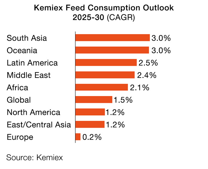 Kemiex’s proprietary outlook model forecasts a +1.5% compound annual growth rate for global feed consumption between 2025 and 2030. Highest absolute tonnage growth is expected in Latin America, East-Central Asia, and South Asia. Highest growth rates are led by South Asia (+3.0% p.a.), Latin America (+2.5% p.a.), and Middle East (+2.4% p.a.), whereas for Western and Eastern Europe only +0.2% p.a. growth is expected, and about +1.2% in both North America and East-Central Asia.