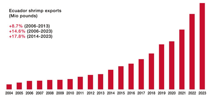 If you want to contemplate the overall impact of technology and farm protocol improvement in the industry, you need to look at the country’s shrimp production and exports. From 2006 to 2013 (after the post-white spot syndrome epidemic) the average yearly exports growth was 8.7%. When the technification journey began and farmers started using nurseries, aeration, and automatic feeding, production experienced a positive impact. In 2014 – the year in which the automatic feeding journey started – exports increased an average of 18% since then until 2023.