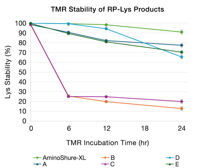 Additionally, lysine is very hygroscopic, meaning it attracts water. For this reason, lysine is difficult to encapsulate to make it rumen protected and is particularly unstable in moist environments such as a total mixed ration (TMR). It is critical that any encapsulated lysine is well protected and stable in TMR. An analysis of TMR stability of different encapsulated lysine products (Figure 1) revealed substantial loss of stability in some encapsulated lysine products, meaning the encapsulation is not sufficient in TMR and lysine is released from the encapsulation and will be free lysine in the TMR. When the cow consumes this, any free lysine will be immediately degraded by the microbes in the rumen and will not be available for the cow herself. The most stable encapsulated lysine product was AminoShure™-XL, with 98% TMR stability at 12 hours and it was still 91% TMR stable at 24 hours in the TMR.