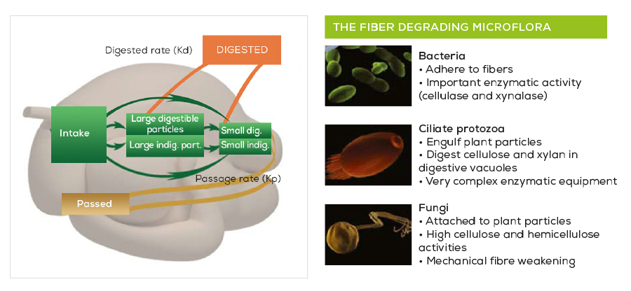 • to the fiber digestion process once it is fed to the animal (mainly located in the rumen).