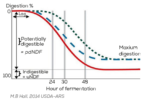 The extent of ruminal fiber digestion is influenced by the digestibility of the fiber (NDFd – see boxed text), the rate of degradation of the fiber (Kd of NDFd) and the passage rate (Kp) of the fibrous material from the rumen.