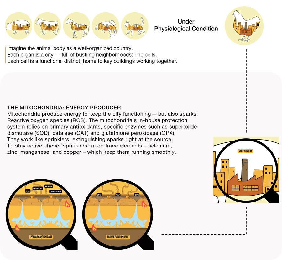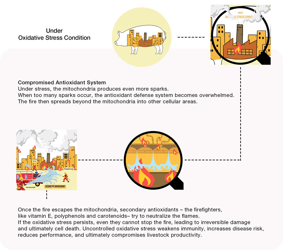 Stressors, such as heat, pathogens, housing conditions and vaccination can induce oxidative stress in the animal’s body – a situation where the whole neighbourhood is burning.