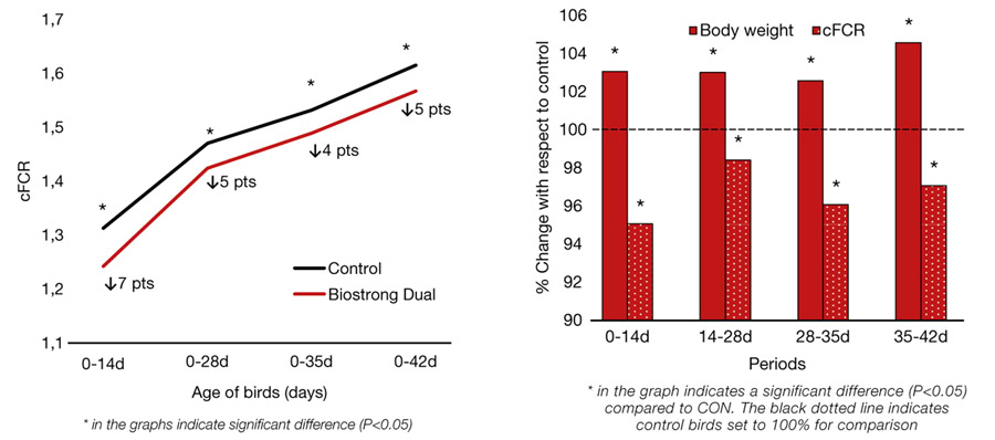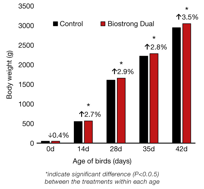 In addition to that, the performance within each period was also significantly improved in Biostrong™ Dual-fed birds (Figure 3). Overall, this data clearly shows the benefits of Biostrong™ Dual in supporting broiler performance during all stages of growth, resulting in birds with higher market weight.