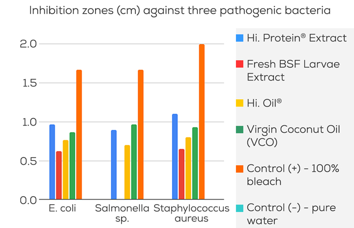 In vitro testing against common pathogenic bacteria such as E. coli, Salmonella sp. and S. aureus, extracts of BSFL oil, meal and fresh larvae were demonstrated to have significant anti-microbial activity, as demonstrated by the bacterial inhibition zone within the petri dish.