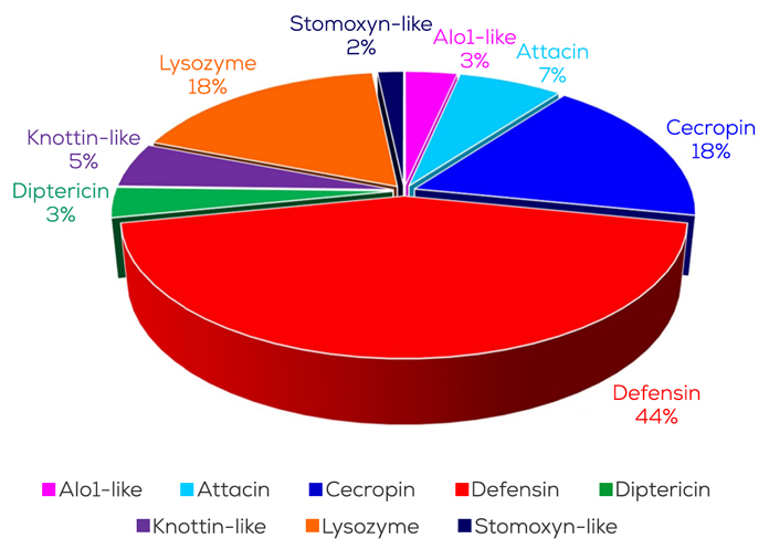 In a 2020 study, a total of 68 AMPs in the BSFL were identified, 57 of which are active peptides with antimicrobial, antiviral, and or antifungal activity. This is more than any other known invertebrate. Because these peptides are so short, they are generally more resistant to denaturation than longer proteins, and tend to withstand the drying and milling process well, so are present in the insect meal.