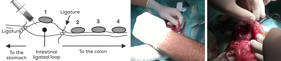 In the study, the authors compared the effect on the production of cytokines by injection of endotoxins with or without the addition of the toxin binder. Based on a model of Vandenbroucke et al., 2011, the ex vivo model was intestinal loops of live piglets. The study consisted of surgery on two female piglets at 5 weeks of age. Intestinal loops 8 cm long of jejunum were used as experimental units (Figure 2).