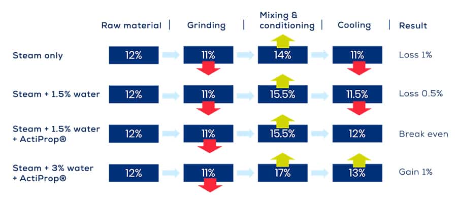 The loss of moisture is usually compensated during the conditioning step through the addition of steam. However, high temperatures also cause evaporation during cooling. A commonly used solution is to add water, along with steam, to compensate for evaporation. This process is not free of risks free water within the feed particles can remain on the surface of the final product, creating favourable conditions for moulds and other microorganisms to take advantage.