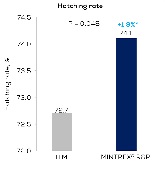 Also in a commercial trial, we observed higher hatchability (as seen with the MINTREX® Trace Mineral Reduce and Replace™ strategy). Therefore, with more eggs and better hatchability, we increased the number of chicks per housed hen.