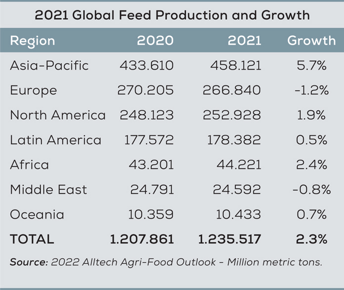 According to the 2022 Alltech Agri-Food Outlook, recirculating aquaculture systems (RAS) are becoming more prevalent, and consumer demand for fish is on the rise. Markets with ASF challenges recorded additional growth due to their reduced pork supply. India recorded a significant increase of 9% in its aquaculture feed tonnage; additionally, Indonesia accounted for 10% of Asia-Pacific’s growth. In Latin America, Chile, Brazil, Honduras and Ecuador contributed to the regxional growth of 5.6%.
