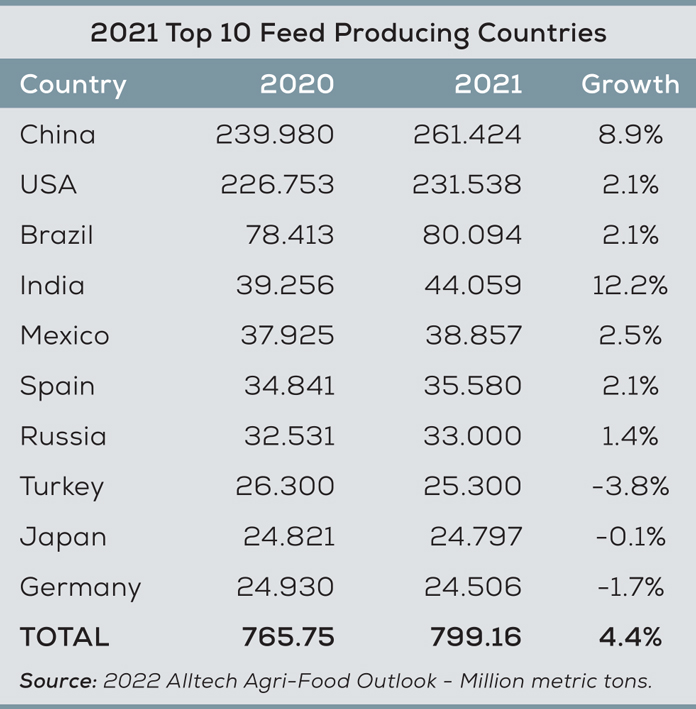 The top 10 feed-producing countries around the world, representing 65% of the total world feed production, produced 799.1 million tons of feed. In total, feed production in these countries increased by 4.4% compared to 2.3% global growth.