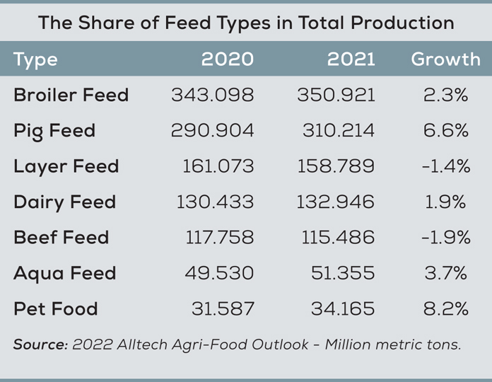 Agri-Food Outlook 2022 report, prepared by Alltech, provides much more up-to-date data. According to this report, the amount of compound feed production carried out all over the world in 2020 was 1,207.9 million tons. This amount reached 1,235.5 million tons with an increase of 2.3% in 2021.