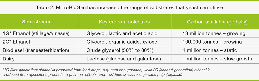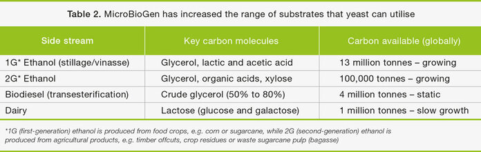 Microorganisms used for SCP production typically rely on traditional food sugars for growth. However, this sugar-based approach is expensive, costing approximately US$0.40 per kilogram, with substrate costs reaching nearly US$1,000 per tonne of SCP – a significant barrier to economic viability in feed markets. In contrast, industrial side streams present a major valorisation opportunity. MicroBioGen’s yeast-based SCP technology can utilize various industrial side streams (Table 2), transforming low-value by-products into high-quality protein. This process not only reduces disposal costs and environmental impact but also aligns with circular economy principles.
