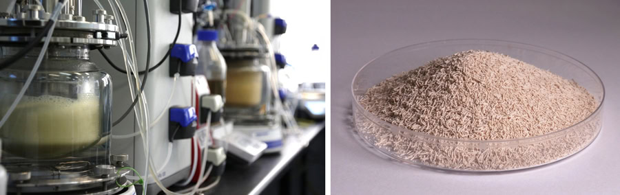 Photographs: MicroBioGen’s bioreactors can accurately represent industrial scale processes (left); A sample of live, dried MicroBioGen yeast (right)