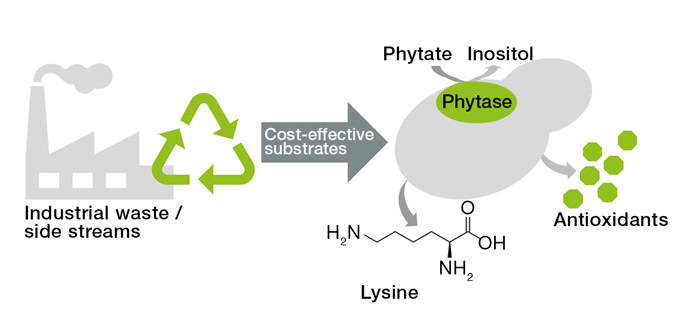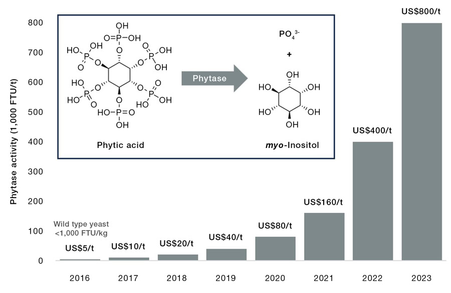 To address this, feed producers often add exogenous phytase enzymes to break down phytic acid. MicroBioGen has developed a non-GM yeast that produces over 500 times more phytase than standard yeast (Figure 2).