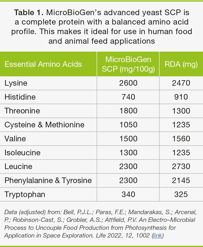 A significant challenge in substituting fish meal with alternative protein sources is achieving comparable nutritional quality. Fish meal contains approximately 65% protein and boasts a well-balanced amino acid profile, which is vital for the growth and health of farmed fish and shrimp. Although MicroBioGen yeast SCP contains slightly less protein than fish meal (up to 60%), it is considerably more protein-rich than standard baker’s yeast (~45% protein) and closely aligns with the recommended daily allowance of essential amino acids for both humans and animals (Table 1).