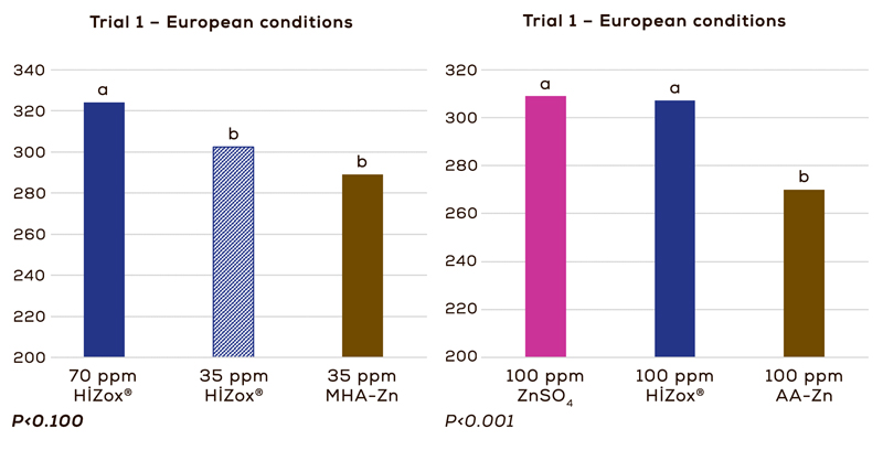 Although these two trials were not designed to evaluate bioavailability, by tibia Zn results we can see that HiZox® provide at least the same or better Zn deposition than the Zn-chelate. Regarding performance parameters, HiZox® provided the same values as chelates: in trial 1 no differences on average daily gain (ADG) were observed (60.5 g/d on average); in trial 2, a tendency for a better ADG and FCR for HiZox® (61 g/d, and 1.39 g/g) in comparison to sulfate (58 g/d, 1.41 g/g) and chelates (57 g/d, 1.42 g/g) was observed.